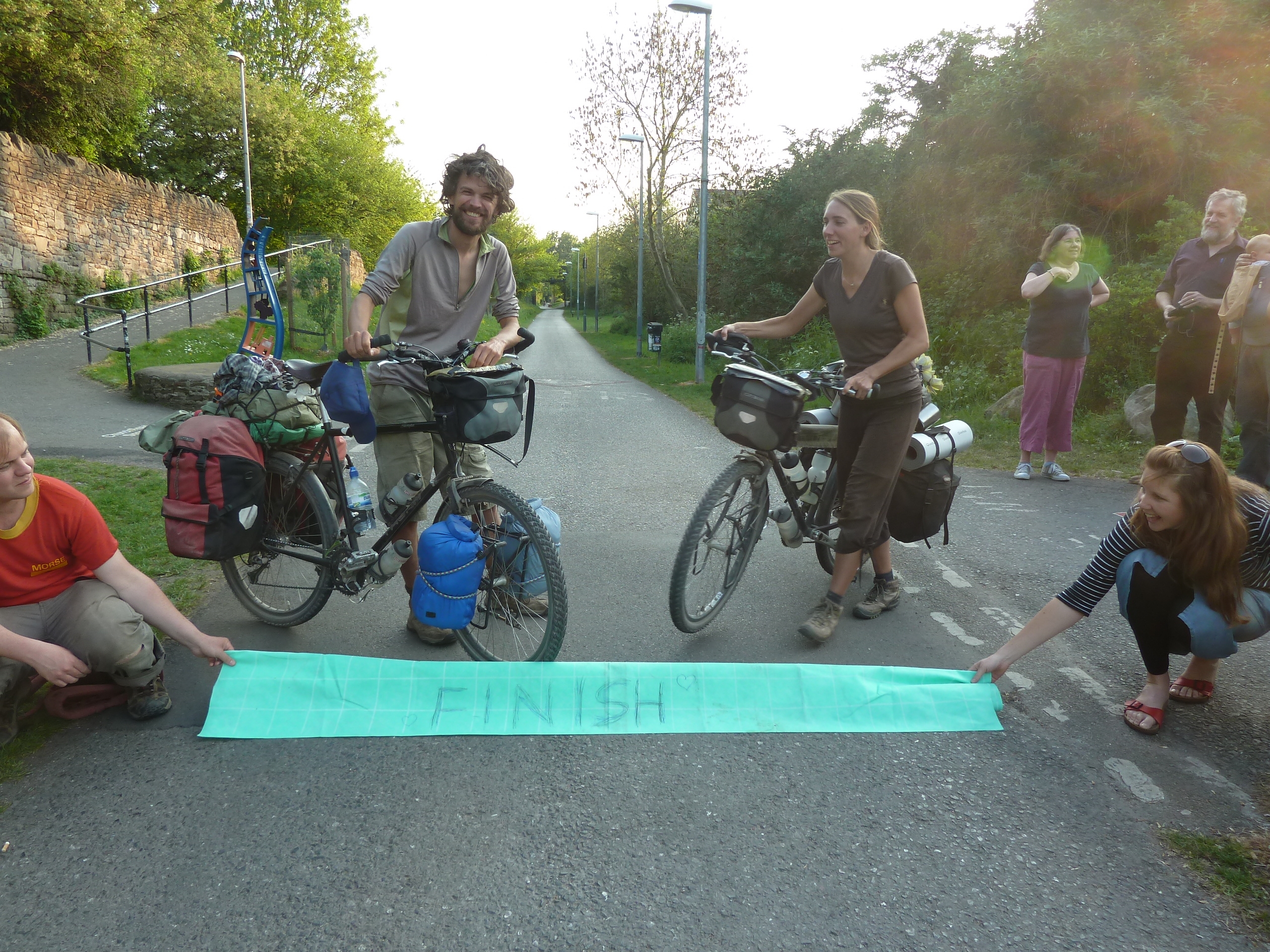 The video is a bit closer to home. Kat was doing a PhD research project into cycling cultures in different cities and soon after our return from India we met her on the Bristol Bath bike path. It was part of an arts trail project and we were exhibiting some photos from the trip and I was playing my songs through a battery powered amp by the path. Kat wanted to interview us for her project and then take a David Hockney like picture collage of us on our bikes outside an abandoned chocolate factory. (We met some great characters that day including a professional metal detector offering call outs for lost wedding rings. He wrote his number on the back of a business card for a dementia care home.)